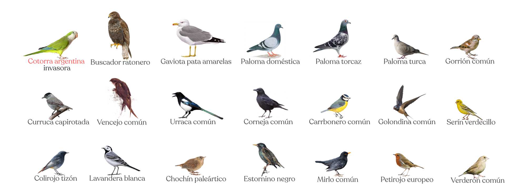 La correcta identificación es el primer paso para una gestión eficaz de la fauna urbana. Esta imagen detalla algunas de las aves más habituales en edificios y zonas públicas, como las diferentes variantes de palomas, gaviotas y estorninos. También señala especies invasoras como la cotorra argentina, cuya presencia requiere estrategias específicas.