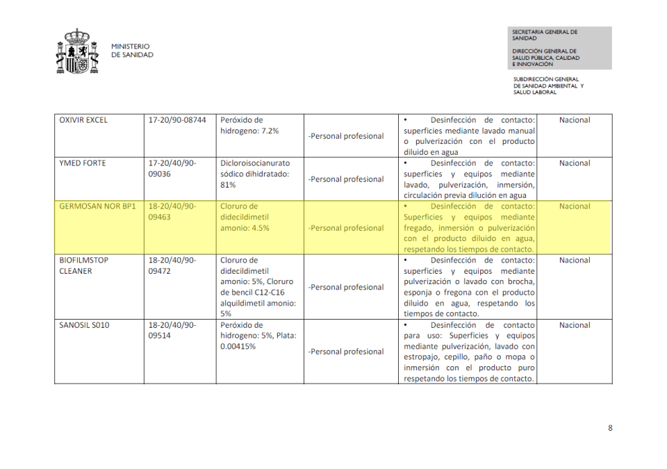 Productos Virucidas establecidos por el Ministerio de Sanidad.